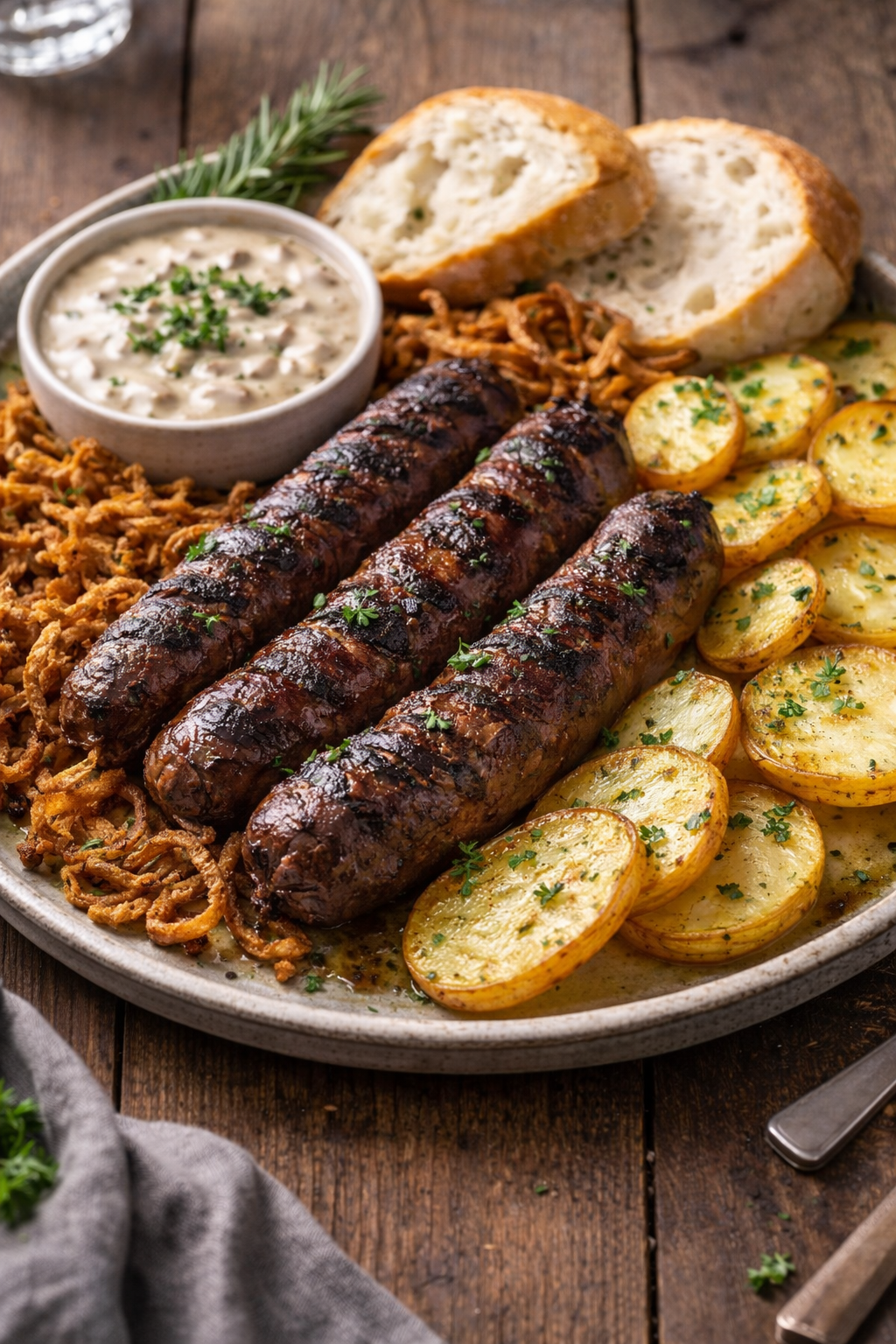 Grof Lovski roštiljke od divljači, umak, prženi luk, ploške krumpira,