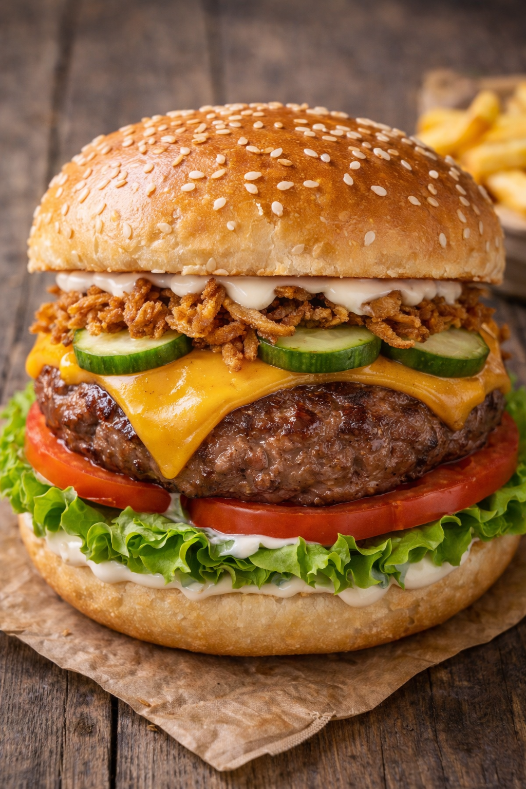 pljeskavica, umak, zel. salata, sir, rajčica, krastavci, prž. luk